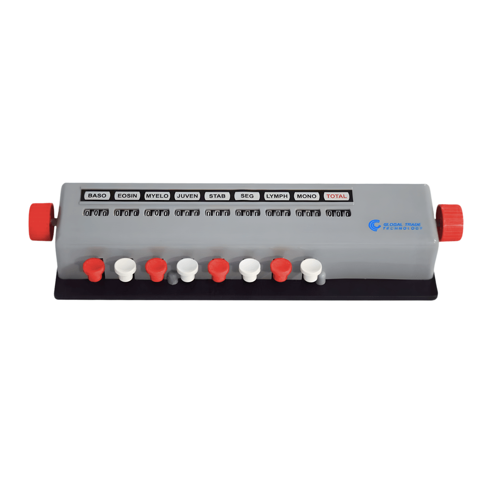 O contador manual de células sanguíneas Mod. GT-08HM é um instrumento utilizado em laboratórios de análises clínicas, especialmente na área de hematologia. Com estrutura externa moldada em plástico ABS resistente e base e mecanismo interno em metal, o contador manual de células sanguíneas possui 8 teclas e botões nas duas extremidades para zerar a contagem.