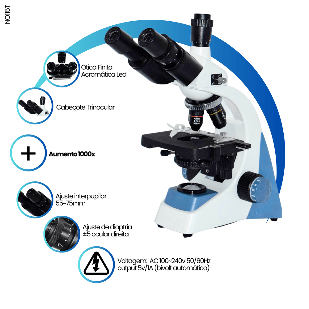 • R: O Global Optics NO115T é um microscópio biológico trinocular de uso profissional, desenvolvido para observação de amostras em lâminas laboratoriais. Possui sistema óptico acromático, iluminação LED de alta intensidade e ampliação de até 2500x, sendo ideal para laboratórios clínicos, veterinários, educacionais e de pesquisa.